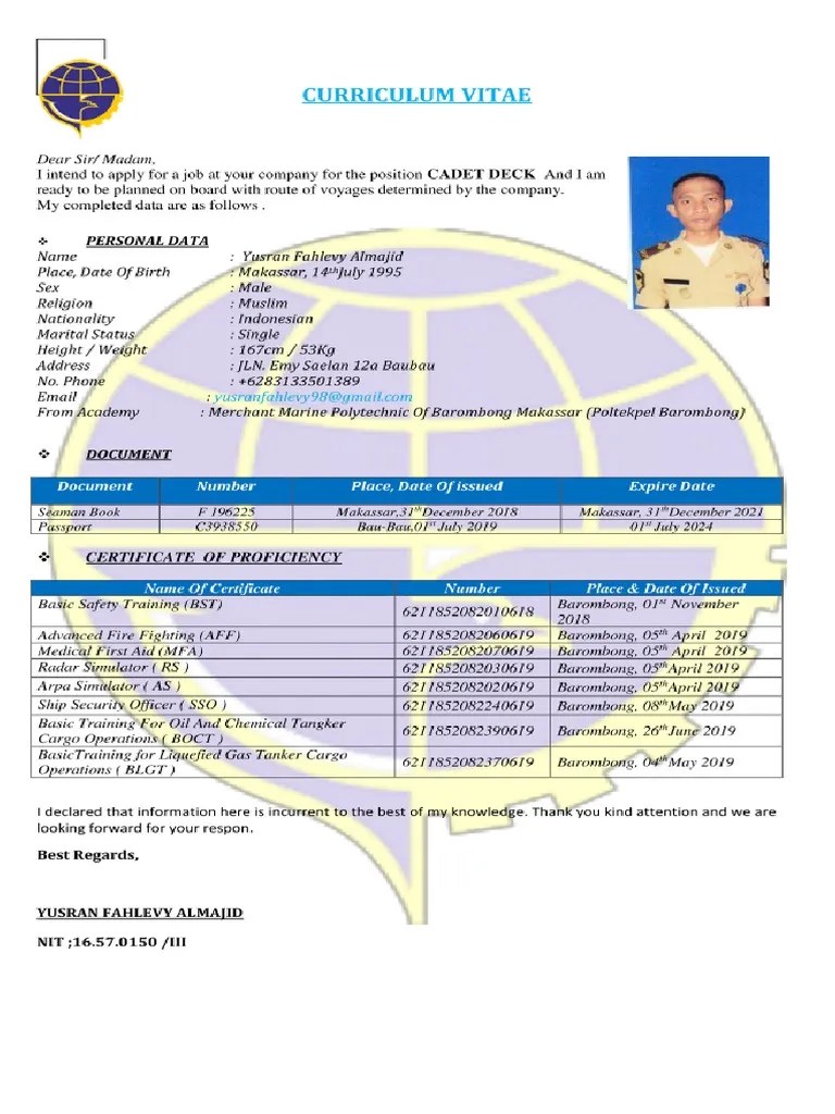 Contoh surat lamaran kerja pelaut. Pada video kali ini saya akan berbagi video tentang cara membuat cv yang menarik . Jabatan dari pelaut ada tiga . File download contoh cv pelaut doc pdf ini mempermudah kamu dalam membuat cv lamaran kerja sebagai . Contoh cv pelaut tentu berbeda. Cv pelaut memiliki perbedaan dengan cv untuk melamar kerja lainnya. Untuk cv pelaut dibedakan menjadi beberapa bagian, tergantung dari jabatan yang mereka miliki. Contoh curriculum vitae pelaut + download cv pelaut; Bagaimana cara kirim cv yang tepat ? Lowongan kerja pelautkapal pelautkapal jobs. Cv curriculum vitae yang baik akanmenarik perhatian para perusahaan. Jumpa lagi bersama saya disharing channel. 30 contoh cv daftar riwayat hidup terbaru 2018 siap download.